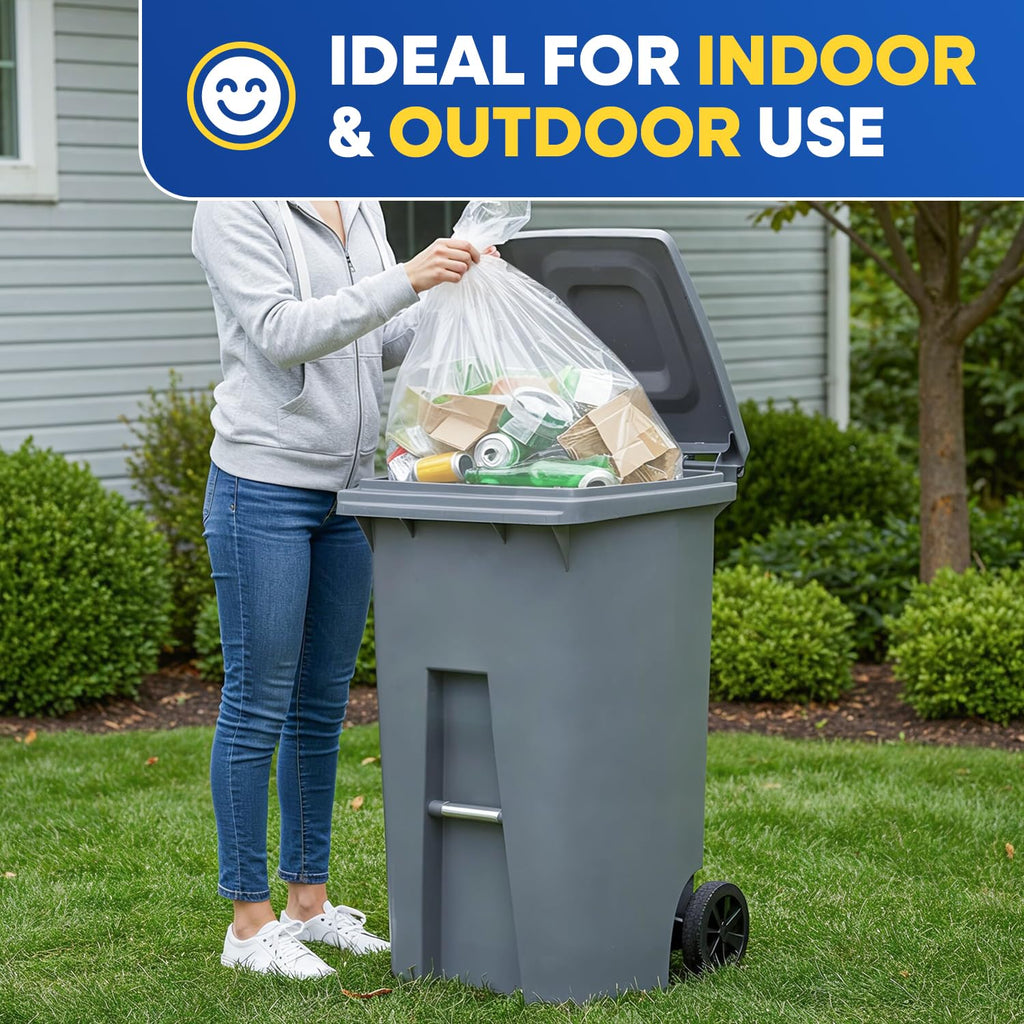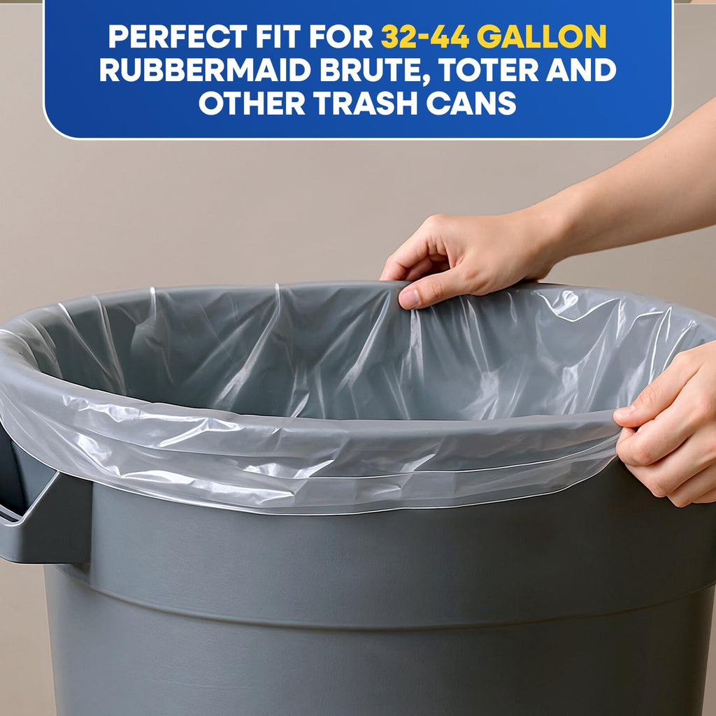 Simplify waste disposal with our (100 Pack) 40-45 Gallon Clear Trash Bags. These heavy-duty 2 Mil liners are designed for durability, fitting Rubbermaid Brute Rollout, round, and square 32-44 gallon trash cans perfectly. Measuring 40" x 46", these trash can liners provide ample space for your needs. Purchase in bulk for a convenient and transparent solution to keep your space clean and organized.