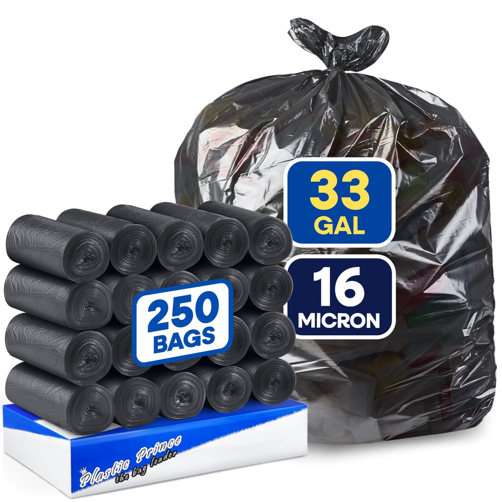 - Garbage Bags 33 Gallon: PLASTIC PRINCE trash can liners hold up to 33 gallons (124.92 L), making them ideal for handling large amounts of waste in homes, offices, and commercial spaces. Each bag measures 33”W × 40”L (83.82 × 101.6 cm), providing ample coverage for standard-sized trash cans.
