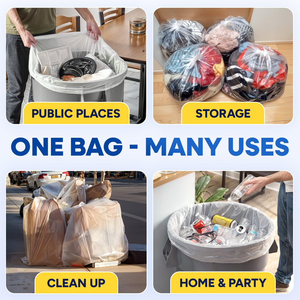 - Clear Visibility: Our clear recycling bags, 40-45 gallon trash bags heavy duty feature a fully transparent design that ensures easy identification of contents and in efficient waste sorting, helping users comply with disposal regulations and simplifying the management of recyclables and waste.