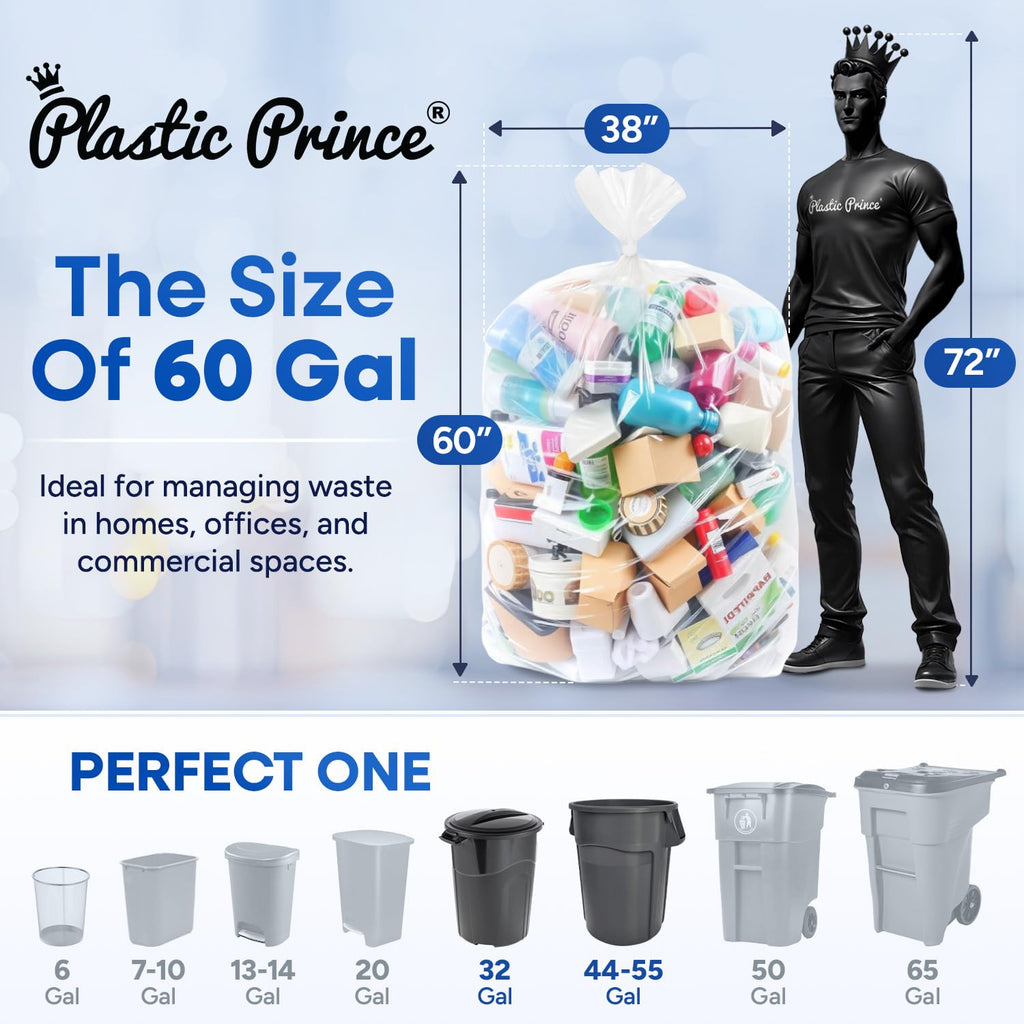 These PLASTIC PRINCE clear trash bags, 60 gallon trash bags, are meticulously crafted to offer a versatile waste disposal solution. These 60 gallon trash bags heavy duty compatible with both round and square trash cans . Our extra large trash bags, designed for both durability and convenience, these large clear trash bags, are an ideal choice for with regular waste disposal needs. The bags are 38"W × 60"L (76.2×152.4 cm), clear garbage bags, contractor garbage bags ensuring a secure fit to prevent slipping, sagging, or spills, while accommodating a maximum capacity of 227.12 l of waste. These industrial garbage bags heavy duty, extra large clear plastic bags are made from 22 micron high-density polyethylene (HDPE), providing an extra layer of resilience compared to standard trash bags. The high-density of our 60 gallon trash bags, recycling bags construction offers superior strength to withstand sharp or bulky items without tearing, making these clear trash bags suitable for environments handling rough, jagged, or heavier waste. The transparent material enables visibility of the contents in the trash can liners, which is especially useful for efficient waste sorting. Each case contains 150 pcs clear trash can liners, drum liners, providing an ample supply with moderate to high waste disposal demands. The bulk packaging of large clear trash bags not only reduces the frequency of reordering but also offers a cost-effective solution. These clear plastic trash bags are designed to fit both round trash can and square trash can. These PLASTIC PRINCE clear large trash bags, clear plastic trash bags are designed to meet the demands of both commercial and industrial users. The combination of durability, visibility, and bulk packaging makes our 60 gallon trash bags, large clear bags an excellent choice.
