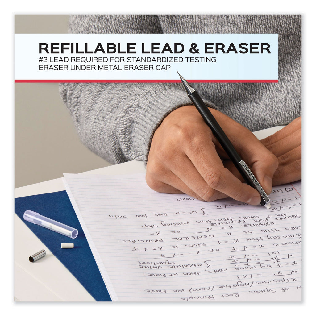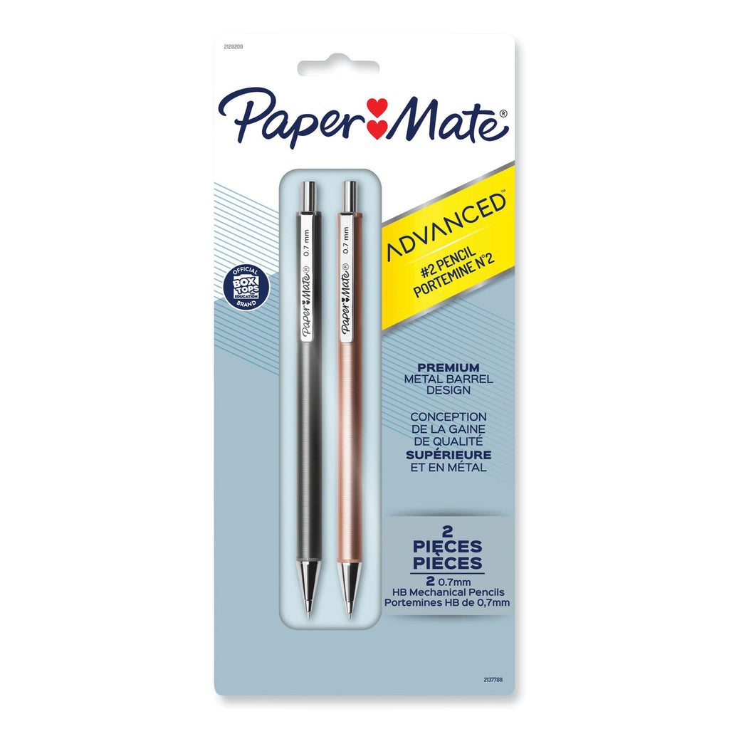 Get the writing performance you expect from Paper Mate in a mechanical pencil that commands attention. Paper Mate Advanced Mechanical Pencils feature a premium metal barrel and durable metal clip that elevate your writing. These Paper Mate mechanical pencils look and feel as good as they write. A retractable metal tip makes it easy to store in pockets, backpacks, and purses, while the #2 pencil lead is the choice for standardized tests. Retractable (Yes/No): Yes; Eraser (Yes/No): Yes; Graphite Color(s): Black; Color Family: Black.