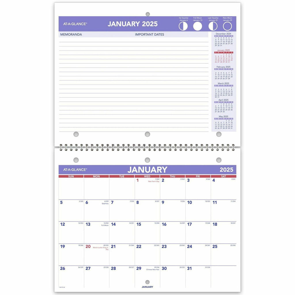 Monthly desk/wall calendar will help keep you up-to-date all year long. Dated planning pages range 12 months from January to December. Two-page-per-month spreads feature nearly a full page of ruled, QuickNotes writing area along with moon phases and one past, current and four future months reference. The other page includes a monthly calendar with unruled daily blocks (1-1/2" x 1-1/4"), count of days/days remaining, Sunday-through-Saturday scheduling, and federal holidays highlighted in red. Wirebound calendar has a bonus page for notes and future planning and is three-hole punched for binder use.