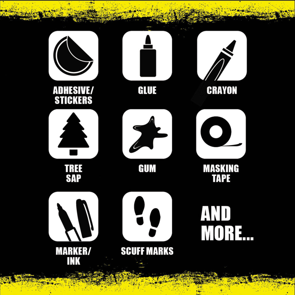 - Great for cleaning scuff marks, masking tape residue, ink spills, paint tree sap, stickers, gum, glue, markers and crayon.