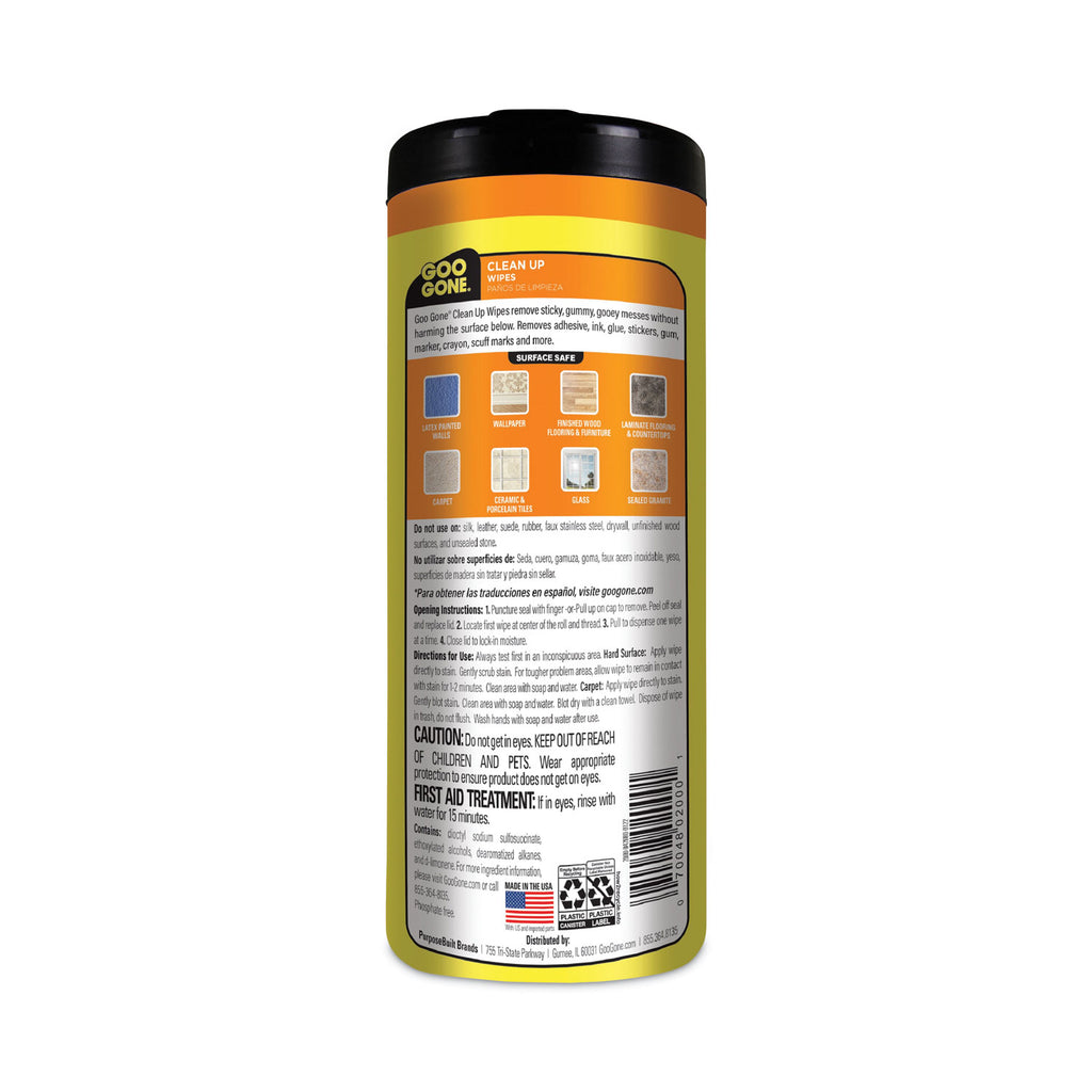Harness the cleaning power of Goo Gone in a convenient wipe. Eliminate your sticky, gooey, gummy problems without harming your surface. The gentle, non-abrasive formula is safe for daily use. Safe for use on latex painted walls, wallpaper, wood flooring and furniture, laminate flooring and countertops, carpet, ceramic tile, glass, stainless steel and granite. Tough task wipes are recommended for cleaning scuff marks, masking tape residue, ink spills, paint tree sap, stickers, gum, glue, markers and crayon. Ideal for quick clean-ups, with an easy to take on-the-go canister. Citrus powered cleansing wipes get the job done without damage. Towel/Wipe Type: Pre-Moistened Wipes; Application: Basements; Bathrooms; Kitchens; Living Rooms; Outdoor Patios; Applicable Material: Carpet; Ceramic Flooring; Countertops; Glass; Granite; Laminate; Painted Walls; Stainless Steel; Wood Flooring; Material(s): Nonwoven Fiber.