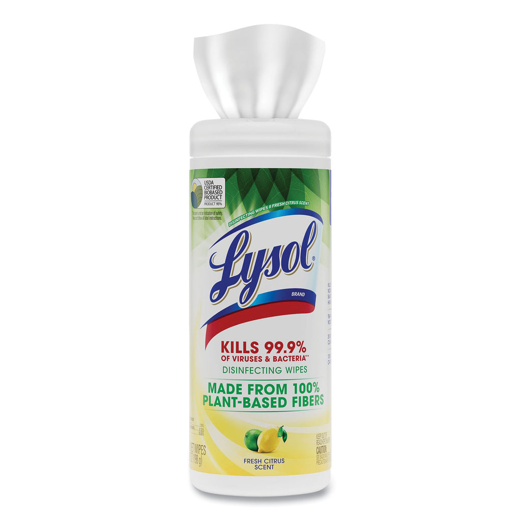 Clean tough everyday messes and uphold sustainability goals with a wipe made from 100% plant-based fibers. Lysol Plant-Based Fiber Disinfecting Wipes disinfect against a broad range of germs and antibiotic-resistant bacteria when used as directed. The effective citric acid formula kills 99.9% of viruses and bacteria, including the virus that causes COVID-19 in 15 seconds when used as directed on hard, nonporous surfaces. Help protect students, customers, and staff with plant-based wipes that are tested and proven to kill Norovirus and Rhinovirus. Help reduce the spread of disruptive cold and flu viruses in classrooms, waiting rooms, break rooms, check-in desks, locker rooms and restrooms. Towel/Wipe Type: Plant-Based Disinfecting Wipes; Application: Hard Surface Cleaning and Disinfection; Applicable Material: Hard Nonporous Surfaces; Material(s): 100% Plant-Based Fibers.