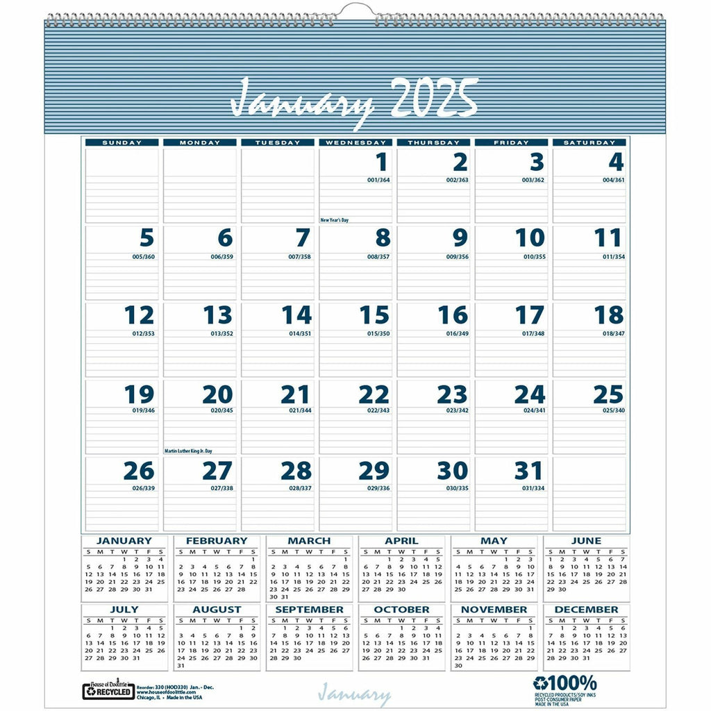 The Bar Harbor calendar with soothing wedgwood blue and gray colors complements any decor with a professional appeal. Dated planning pages range 12 months from January to December. One-page-per-month format includes ruled daily blocks (5/8" x 3/4"), full-year reference calendar, Sunday-through-Saturday scheduling, count of days/days remaining and holidays. Strong wire binding firmly keeps the pages together in one place. Wire hanger lets you easily hang the calendar on the wall. Wall calendar is printed on FSC certified paper with soy inks and made with a high percentage of recycled material.