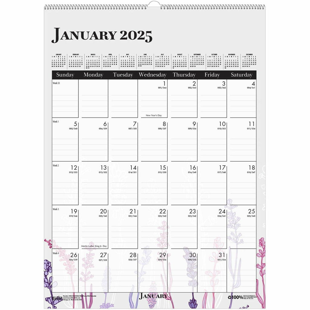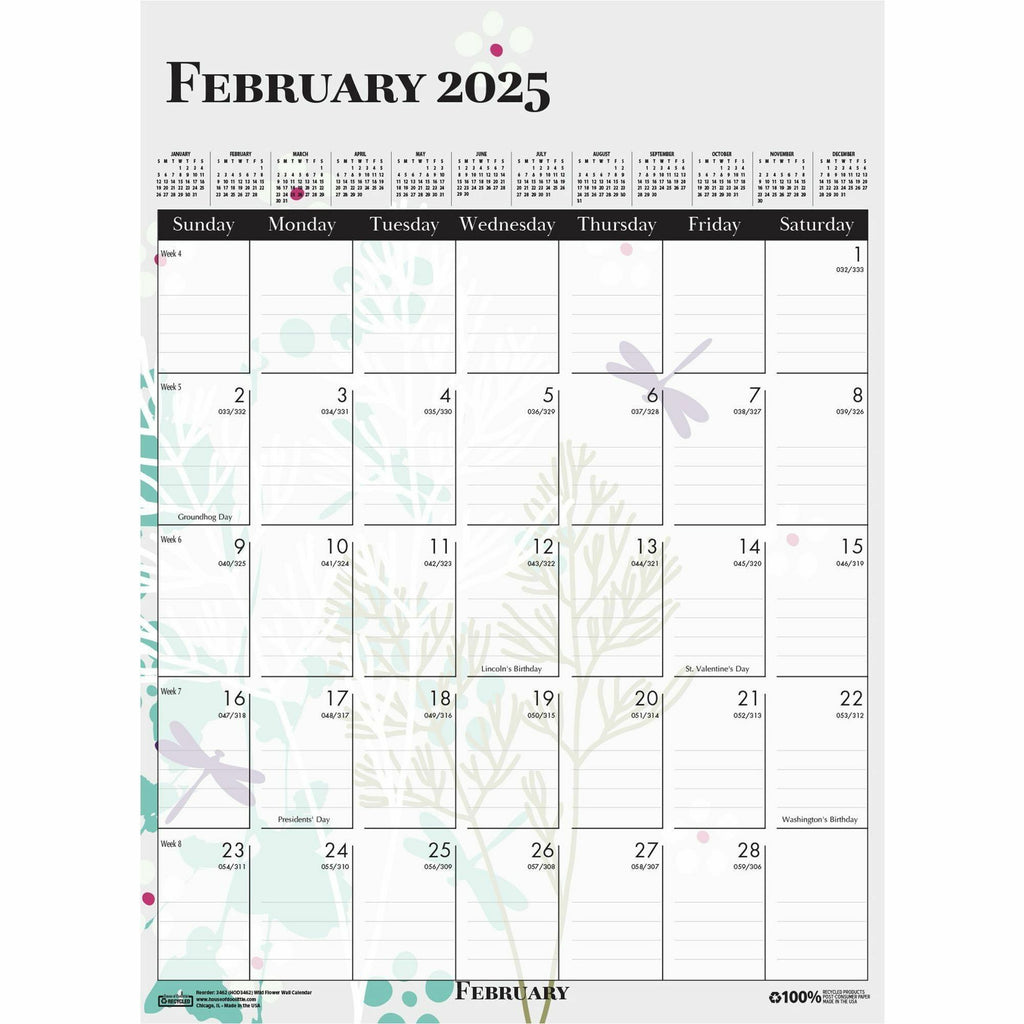 Enhance any office decor with this Soothing Wild Flower Wall Calendar. Each month has a different illustration of a wildflower. Dated planning pages range 12 months from January to December. Recycled spiral binding includes a convenient hanging loop for easy hanging and makes it easy for you to refer to future and previous months. Chipboard backer offers a durable writing surfaces and lets calendar hang flat. One-page-per-month format features ruled daily blocks (2" x 1-2/3") from Sunday to Saturday, count of days/days remaining, numbered weeks, U.S. and Canadian holidays as well as a full-year reference calendar at the top. FSC certified, recycled paper is printed with soy ink.