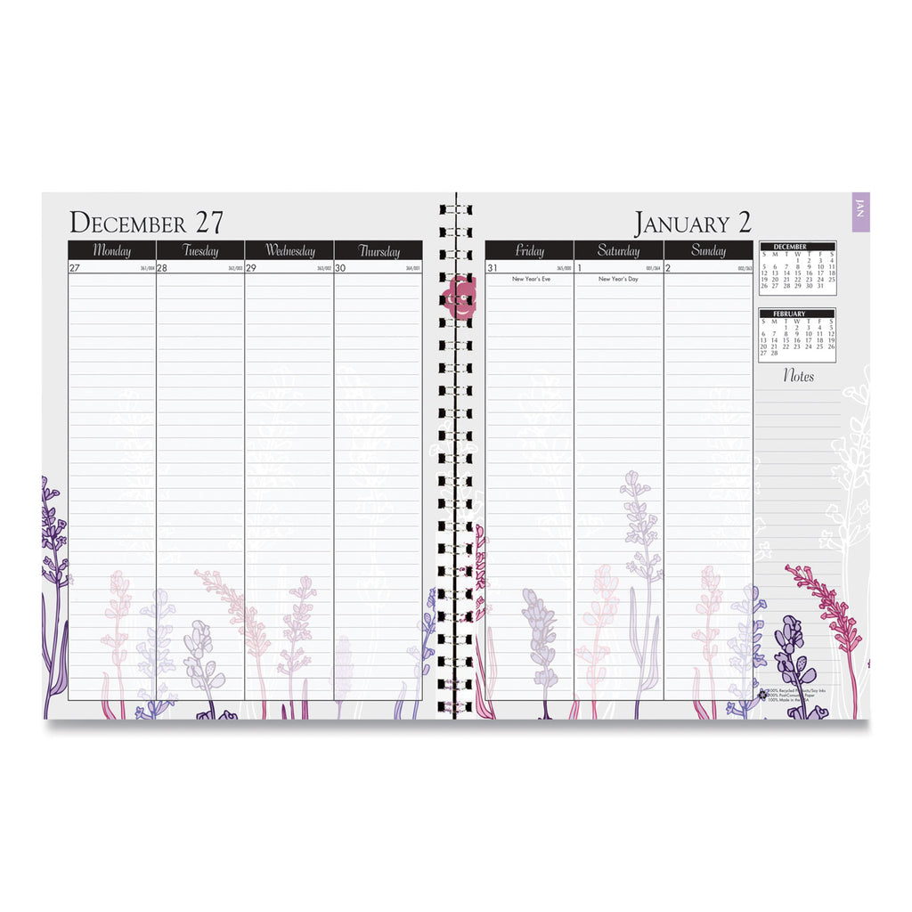 Monthly/Weekly Wild Flower Planner offers easy long-range planning with monthly overviews and weekly detail. Dated planning pages range 12 months from January to December. Each monthly and weekly two-page spreads feature different wildflower illustrations, notes sections, count of days/days remaining, holidays and past and future months reference. Weekly section does not have times so you can enter times or notes for things to do that day. Weekly spreads include ruled daily columns with Monday-through-Sunday scheduling. Monthly overviews have Sunday-through-Saturday scheduling and are tabbed to make it easy to find the month you need. Heavy paper cover has coordinated graphics with the inside of the book. Planner includes a three-year list of common holidays and two-sided paper pocket for notes. Recycled paper is printed with soy ink. Recycled spiral binding lets the book wrap around for easy writing.