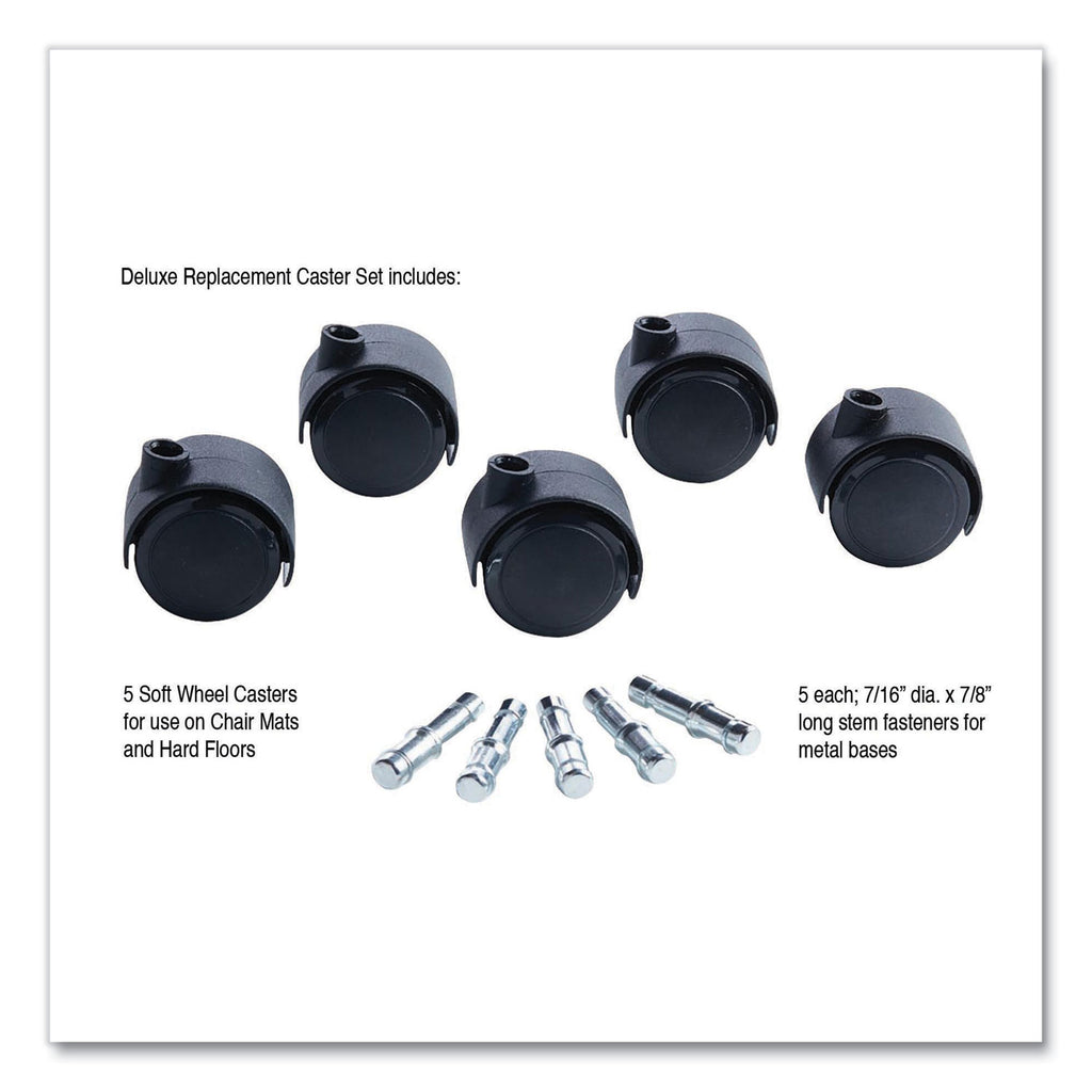 Take the guesswork out of caster stem selection. Includes five wheels and 10 stem fasterner; 5 each 7/16" x 7/8" and 5 each 3/8" x 7/8" to fit most metal bases. Deluxe Duet CastersFully hooded caster design. Soft polyurethane wheels for hard flooring and chair mats. Caster/Glide/Wheel: Caster; Color: Matte Black; Color Family: Black; Stem Type: Grip Ring Type B Stem; Grip Ring Type K Stem.