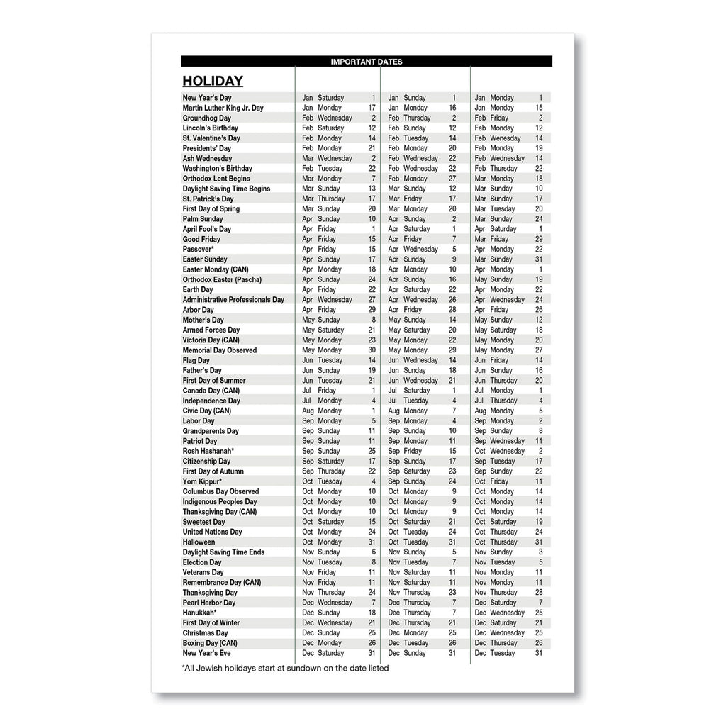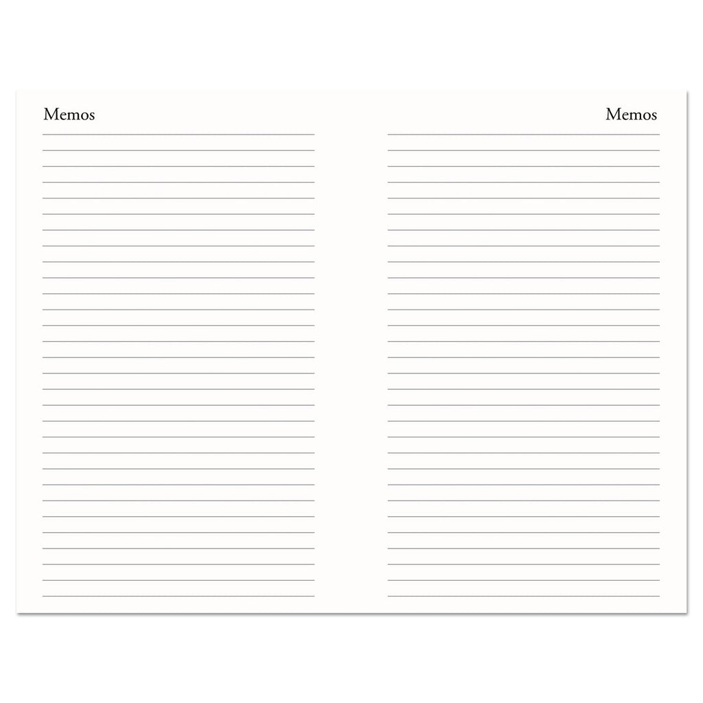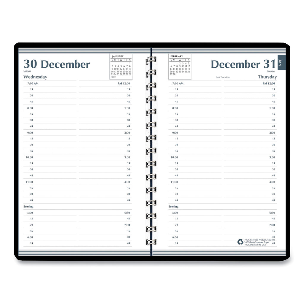 Includes printed monthly indicators to quickly find the date you need. Quarter-hourly appointment increments. Includes a double-sided storage pocket. Durable black embossed simulated leather cover will endure frequent daily use. Strong wire binding to keep pages in place. Made entirely of recycled materials. Dated/Undated: Dated; Calendar Format: Daily; Page Format: One Day per Page (Mon-Fri); Two Days per Page (Sat-Sun); Edition Year: 2024.