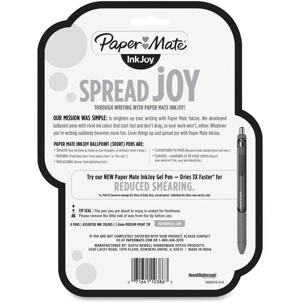 Retractable ballpoint pens feature Paper Mate's revolutionary InkJoy writing system for effortless writing. The InkJoy writing system with ultra-smooth, vivid ink starts quickly without dragging, requires minimal pressure from your hand, and delivers crisp, clean lines every time. Extended rubberized grip provides optimal comfort. Retractable design is ready to write with just a click. Metal clip provides long-lasting durability and can be used to attach pen to pockets, notebooks and more. Transparent color-tinted body of the InkJoy 300 RT offers a refreshing look.
